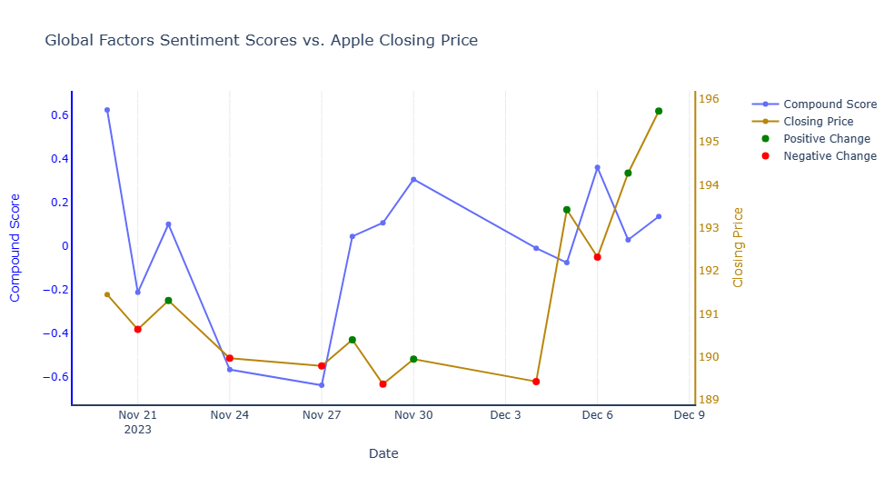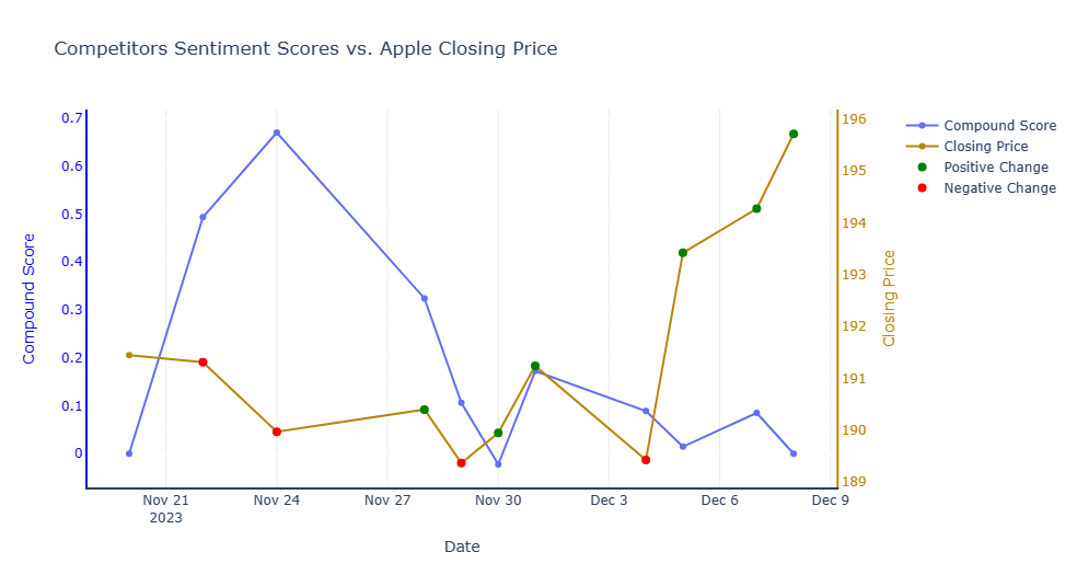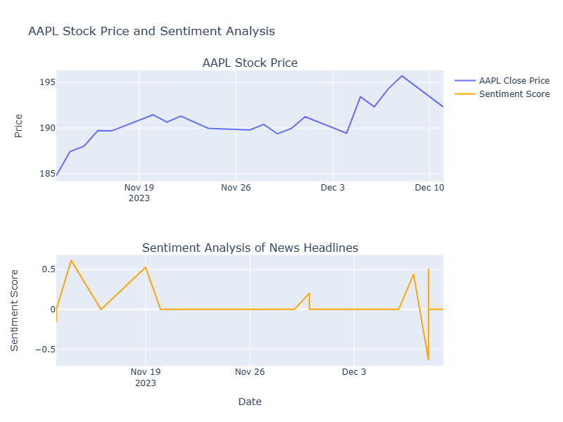 - Plotted sentiment scores against Apple’s stock price, visually highlighting the potential correlations between sentiments shifts and market trends.