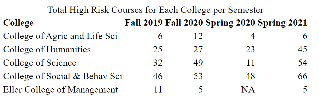 | College | Fall 2018 | Fall 2019 | Fall 2020 | Spring 2019 | Spring 2020 | Spring 2021 |