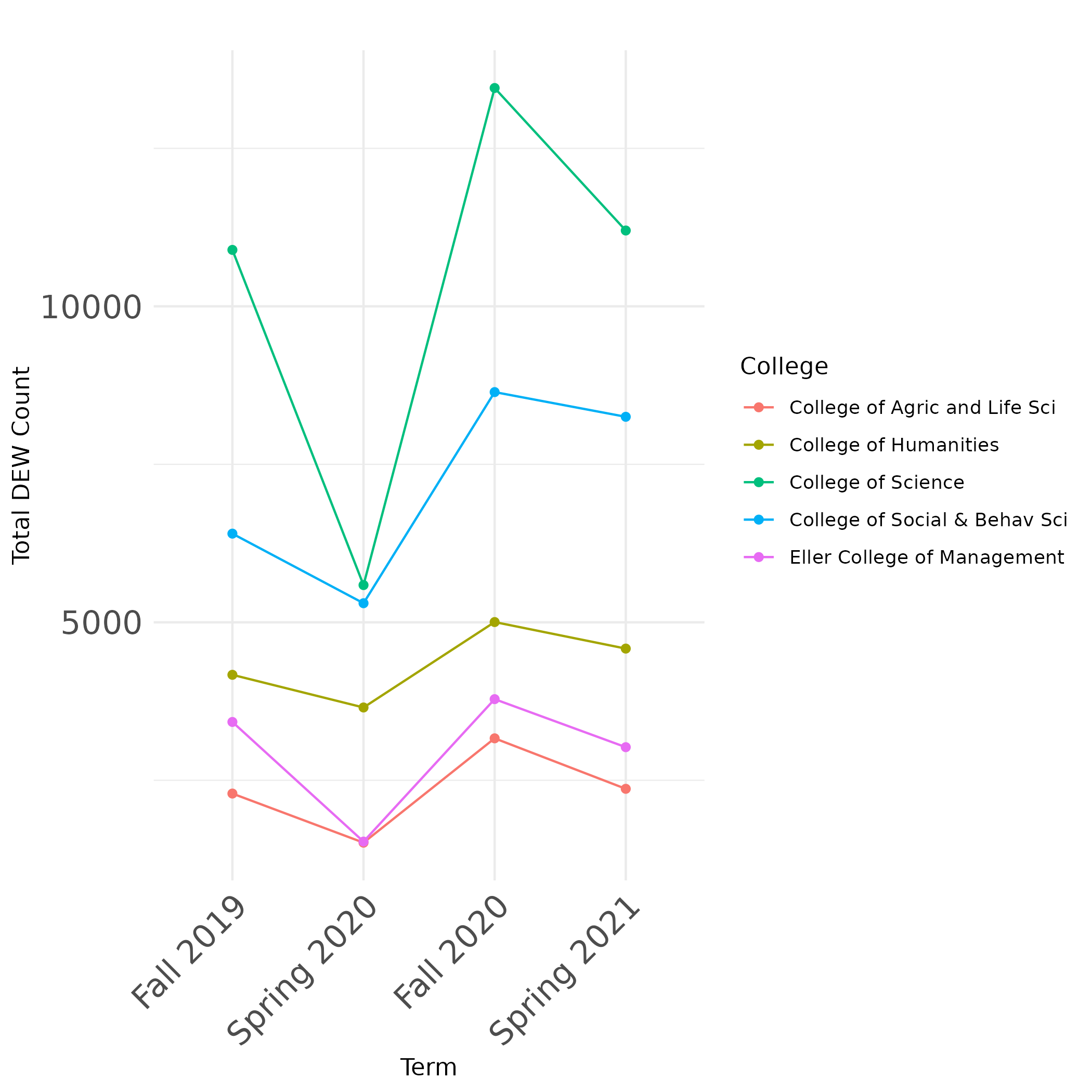 Total DEW Count for different colleges changed over different Terms