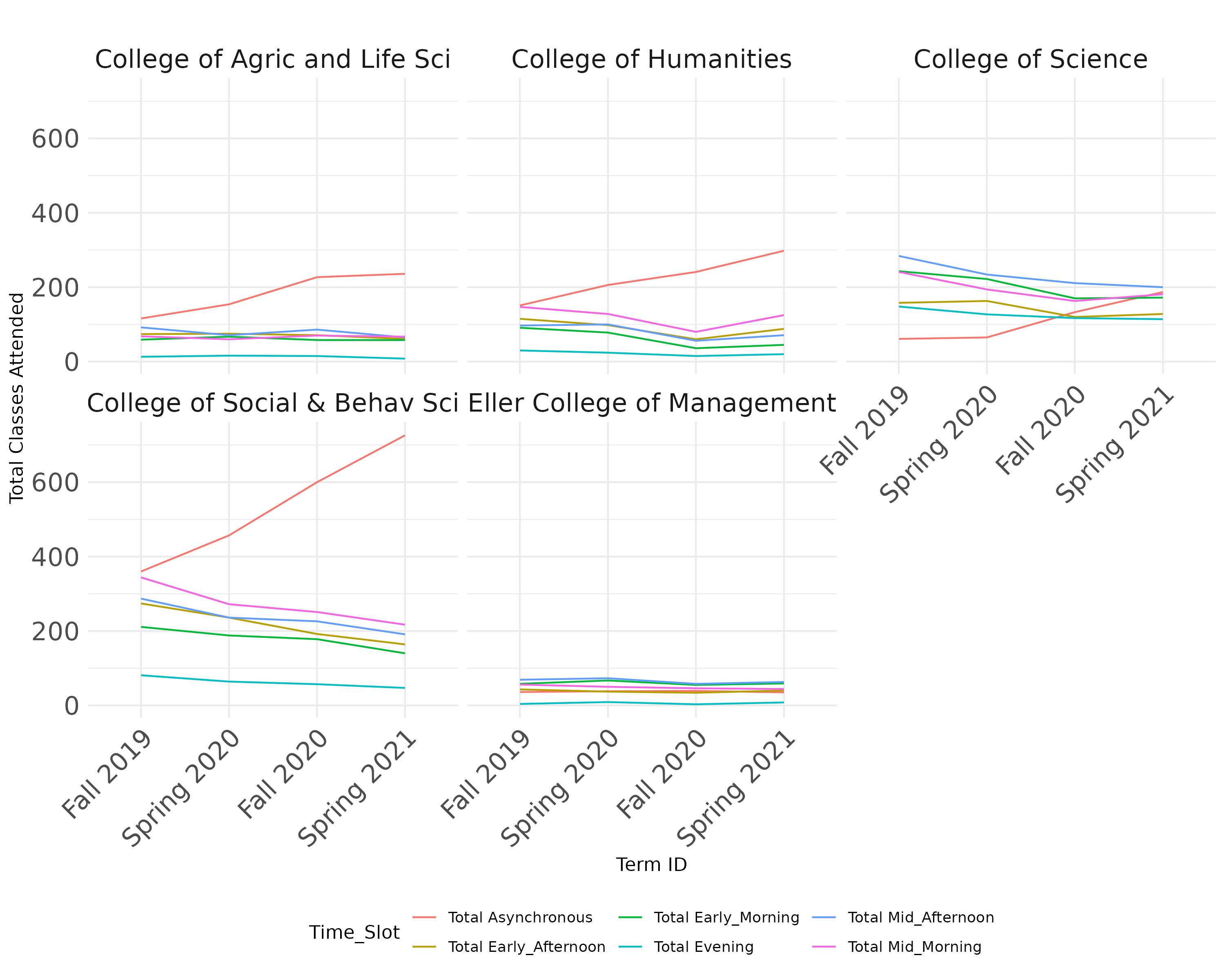 Total Classes Attended in Different Time Slots for Colleges changed over different Terms