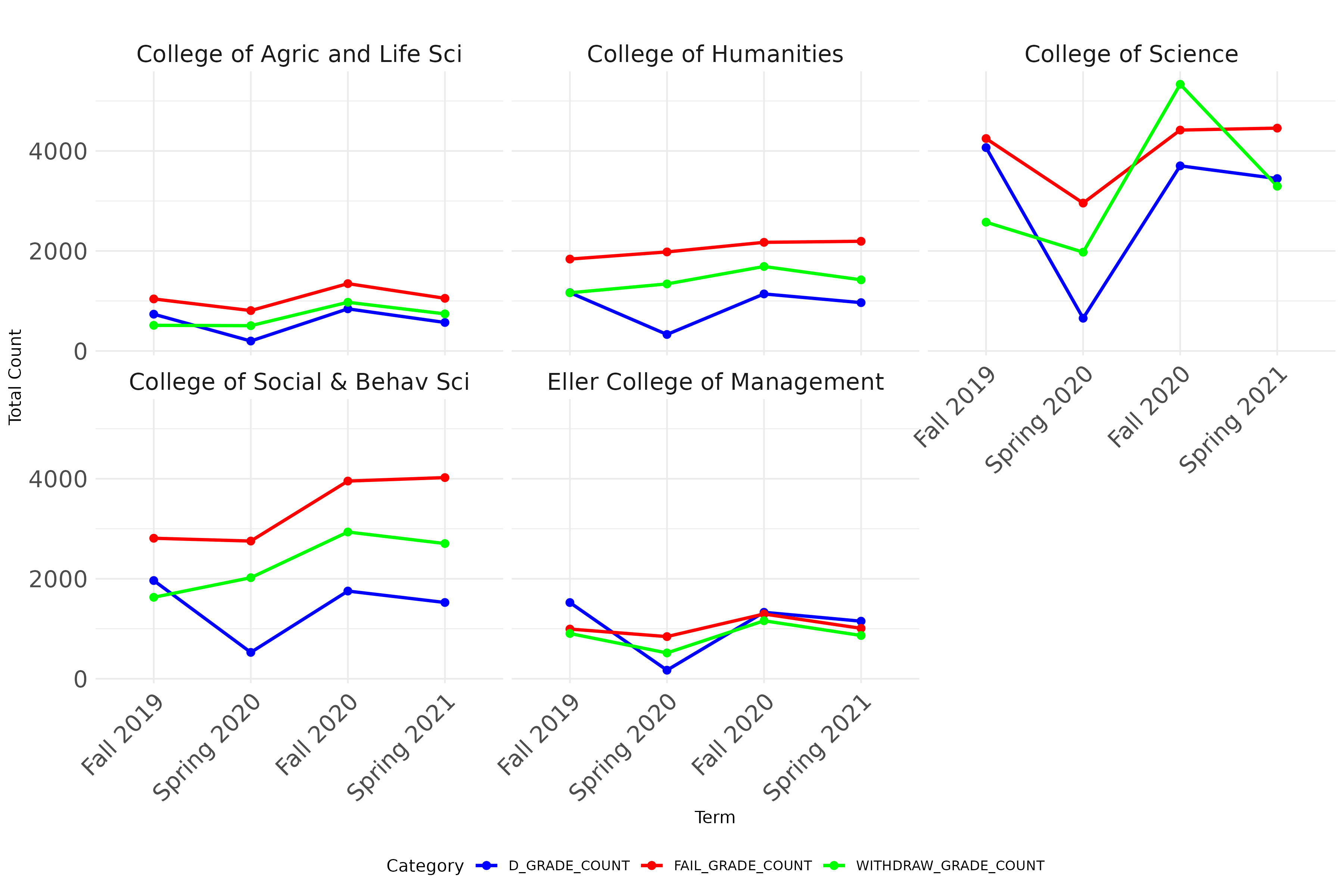Total D, E (fail) and W (withdraw) count for different colleges changed over different Terms